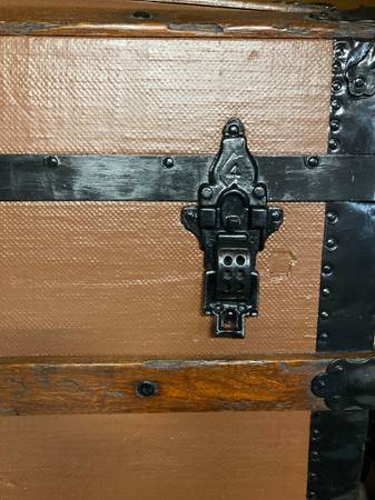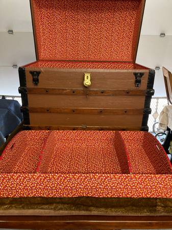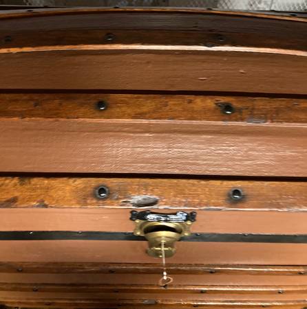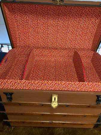 Wood crossbeams, working lock with key. Beautifully lined with removable tray. Treasure storage or blanket chest. Good prop for photos or movie sets, staging etc. Renaissance trunk 37”x22”x34” Text...