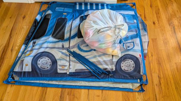 Melissa & Doug Let's Explore Camper Tent Play Set – 47" x 31" x 39" Assembled with 100 Balls. Perfect CLEAN Condition. Sets up in minutes and lays flat for storage. Includes 100 softballs that have all been washed in Dawn dishwashing soap. The camper itself has been washed. Comes with a sunroof on top and a large door on the side and it really does resemble a camper. One small spot of the netting has ripped away but nothing that a little super glue can't fix. It is large so your child has plenty of room. Great to play house in. Ages 2 years and Up. Retail is $30 without balls. Balls will cost you another $25 for this amount. So total retail would be $55.