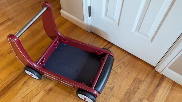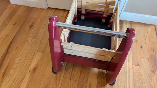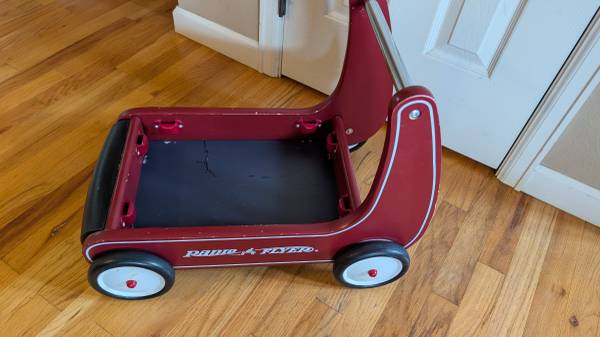 Radio Flyer Classic Push Walker Wagon. Good CLEAN Condition. It has some small chips in the wood and and here and there. Great for the beginning Walker. Rubber front so when they crash into a wall, it doesn't damage the wall. Wheels click as they turn and they are solid rubber. Whole walker is wood which is why there's signs of use. Heavy and sturdy and side rails come off. Ages 1-4 Years. Retail is $80.