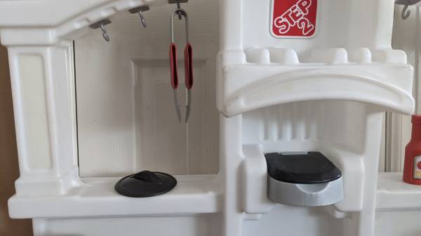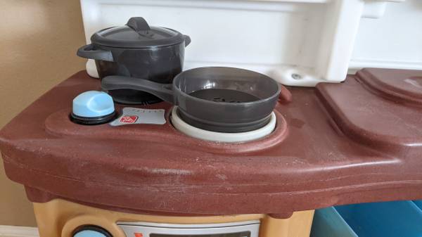 Step 2 Fun With Friends Kitchen. Perfect CLEAN Condition. Includes original accessories like original bins, pot and pan with lid and coffee pot. Burner makes sizzling and boiling noises when the pot or pan is placed on it. Works perfect and looks great. 2 bins that go below the sink for storage of essentials. Dog or cat food and water bowls. Looks good and works like new. Ages 2 Years and Up. Retail ranges from $115-150.