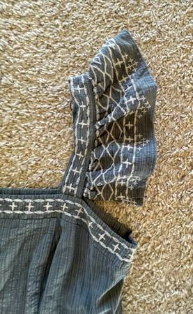Beautiful women's ladies juniors Embroidered flutter Sleeve tiered Dress medium. gray dress with white embroidery and tiered design. Lined, pockets.