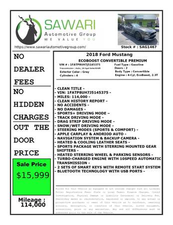 The sporty 2018 FORD MUSTANG ECOBOOST CONVERTIBLE PREMIUM is available for sale. It is a Clean Title with a Clean History Report. It is in excellent condition and has an outstanding performance rating on various automobile forums. -
