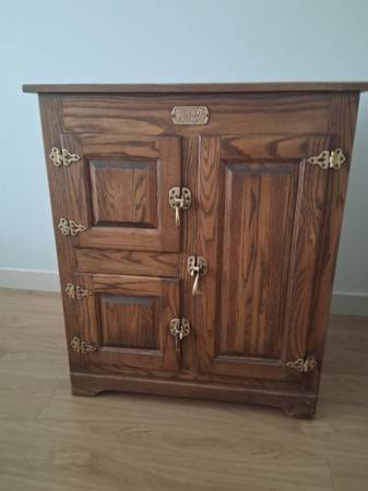 Antique ice box, stopped manufacturing in 1930, so it's at least 95 years old, some minor scratches, rub marks. Who ever had it before me was using it as entertainment center, so it has a couple holes in the back for cords, cash only local pickup only