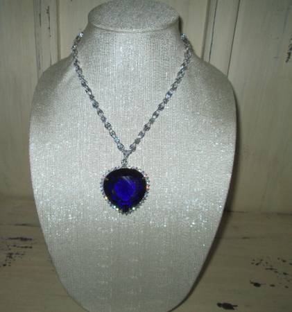 This exquisite necklace has a heavy and beautiful large trillion cut center deep blue sapphire colored, lab created crystal stone set in a rhodium plate setting over copper metal, with 4 prongs.