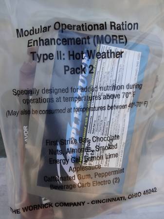 (M.O.R.E.S.) (Modular Operational Ration Enhancement) These items are Not the meals. They consist of snacks and extra energy foods.